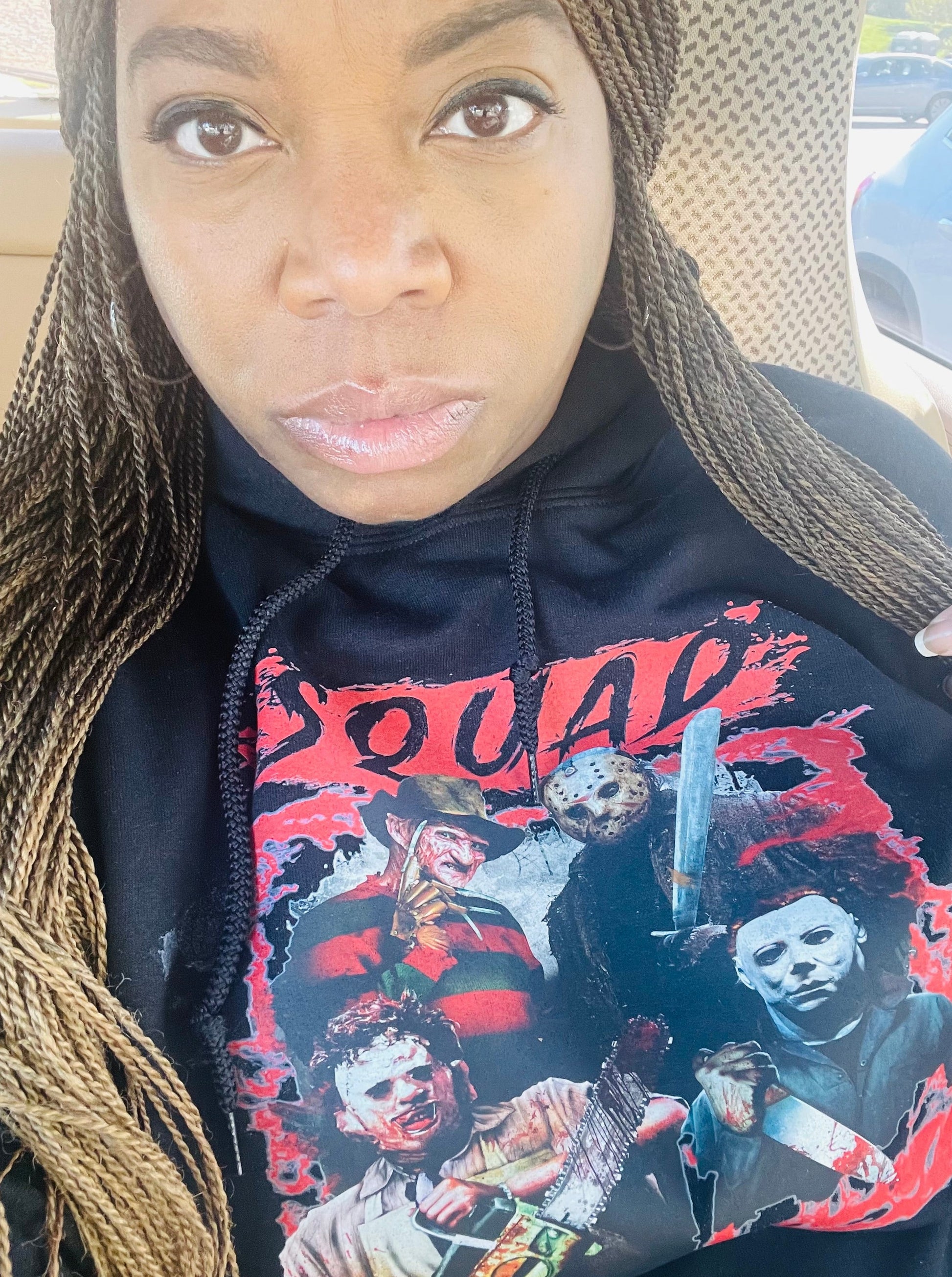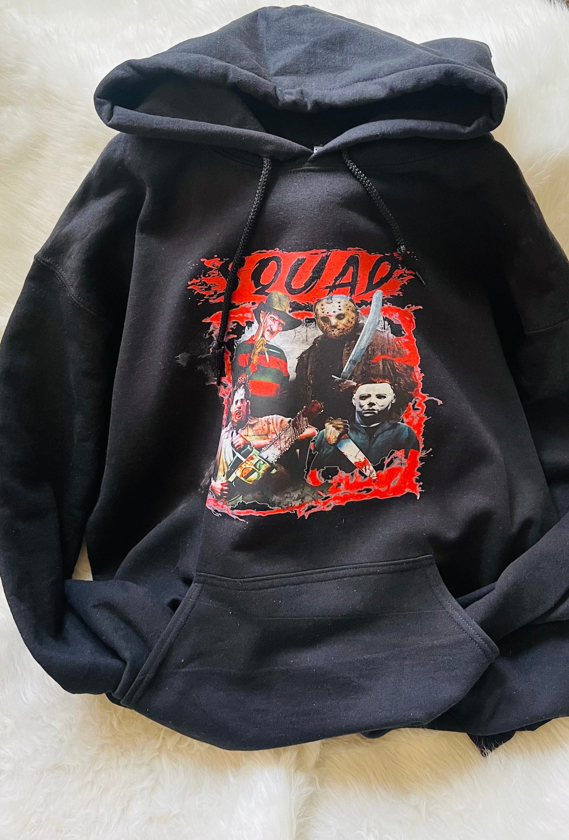 Black hoodie with 90’s Horror menaces “The Squad.” Great hoodie for those cool days and nights! 100% Gliden Cotton hoodie.